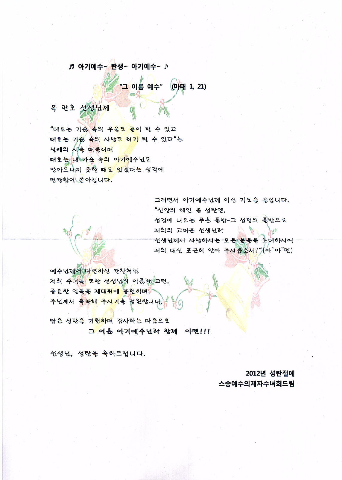 그 후로,  저는  매년 추수 감사절, 성탄절에  예쁜 카드를 받는  분에 넘치는 죽복을 받고 있습니다.    그때마다, 저를 되돌아 보고,  세상을 위하는 일이 무엇인가를  반성합니다. 그리고  행복한  세상을 다시 생각 하며  저에게 맏겨진 사명으로 의료 연구에 더욱 진력 할 것을  다짐합니다.    2012년 성탄절 카드 편지를  공개 합니다.